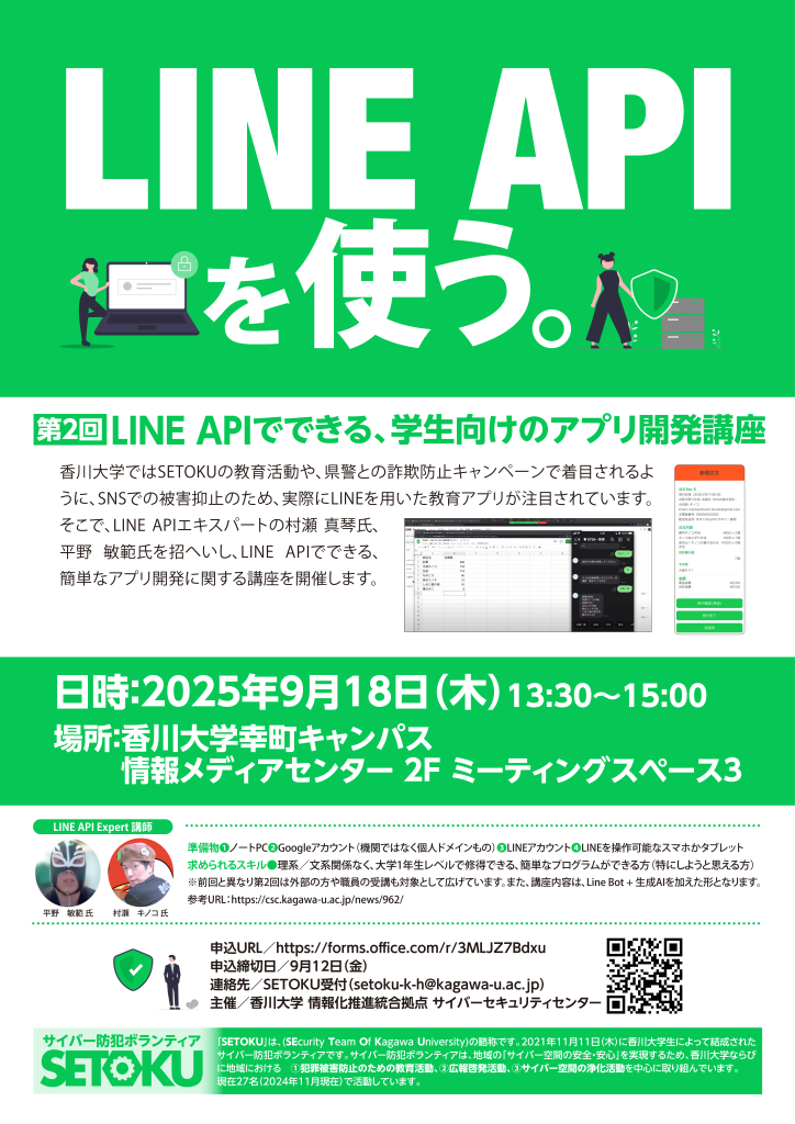 そこで,SETOKUを支援している LINEヤフー社認定 LINE API Experts の村瀬 真琴氏,平野 敏範氏を招へいし,LINE APIでできる,簡単なアプリ開発に関する講座を開催します.